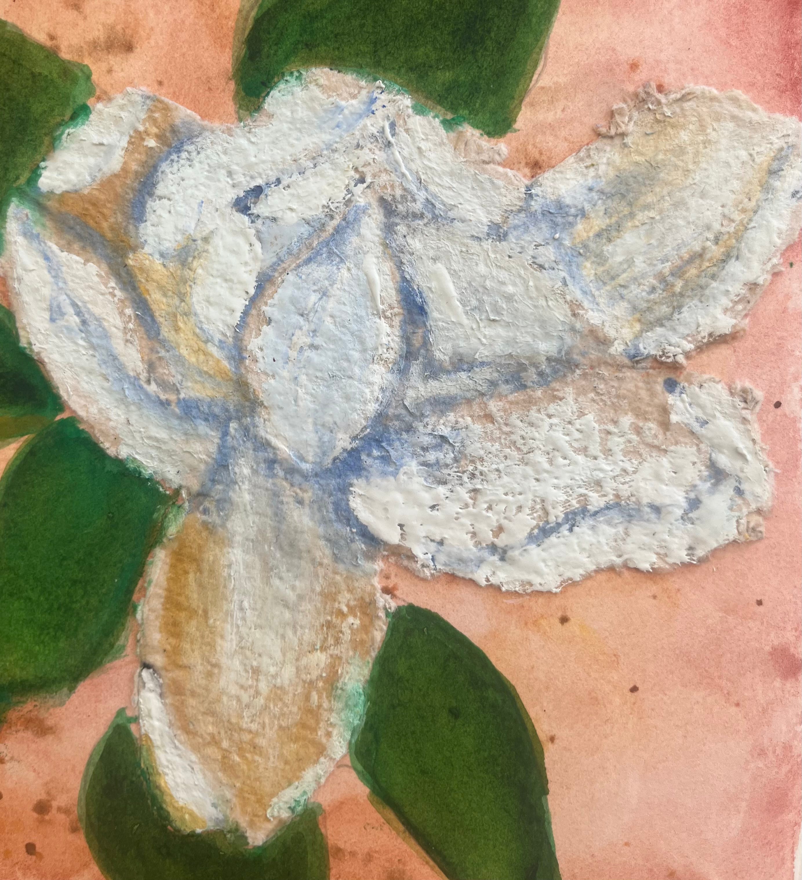 The last weekend of May I took part in a paper making course, which I throughly enjoyed. My Magnolia happened to be flowering and I used some of the paper to recreate the flower in my sketchbook. It was a learning experience finding out that the paper doesn’t like water and disintegrates. I have learnt that I need to gesso the paper so that it can handle paint.