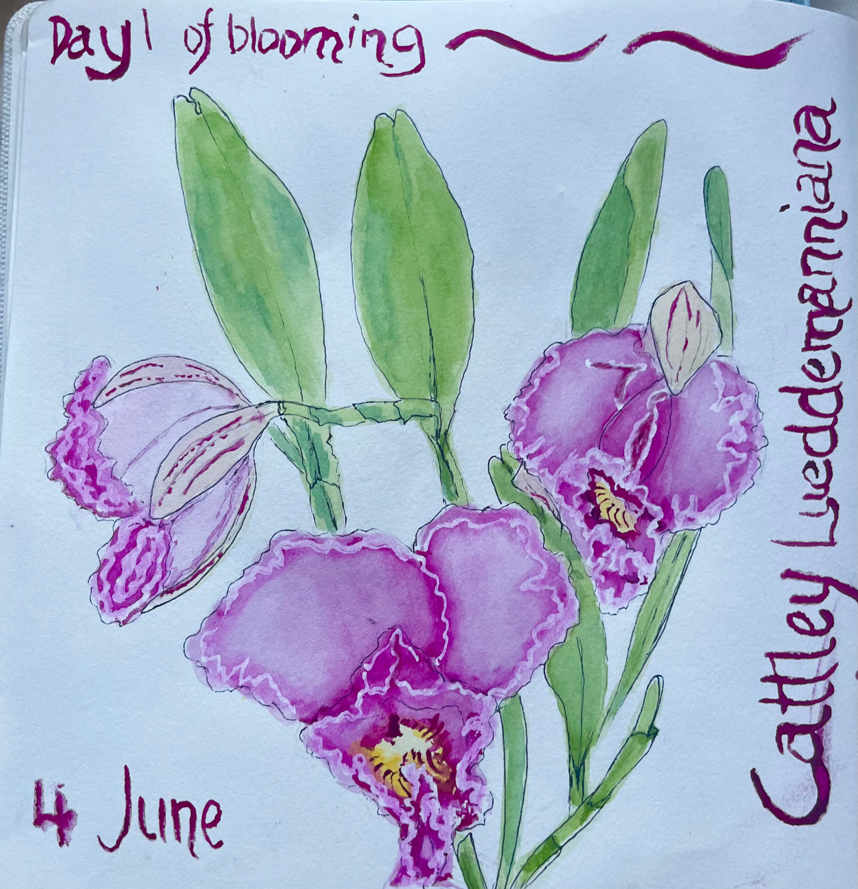 I discovered my Cattleya Orchid had some buds so I brought it inside to sit on the side board in the Dining room. On the morning of the 4th, I was greeted with splashes of Magenta as the flowers began to open. Masking fluid made another appearance as I recorded the first day of these beautiful blooms. Did you know orchids symbolise uniqueness, sensuality, rare. beauty, refinement and enchantment.