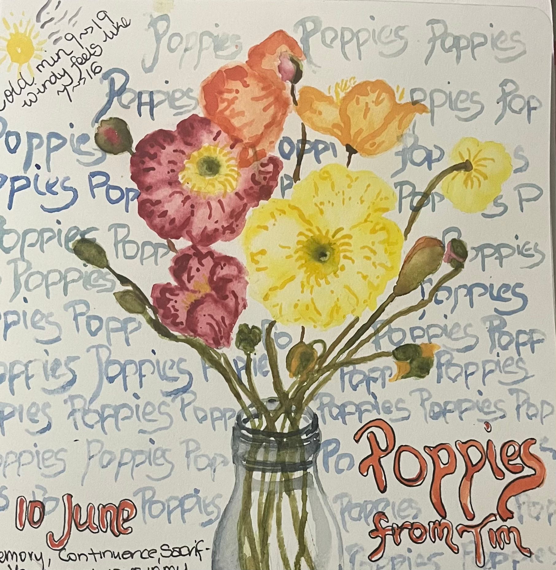 Tim came home from the shops with some beautiful Poppies, that have been a joy to see new flowers each day. It was a cold, windy day and the Poppies were so bright and colourful. Poppies mean ‘you are always in memory’ as well as ‘Continuance and Sacrifice’, which is beautiful.