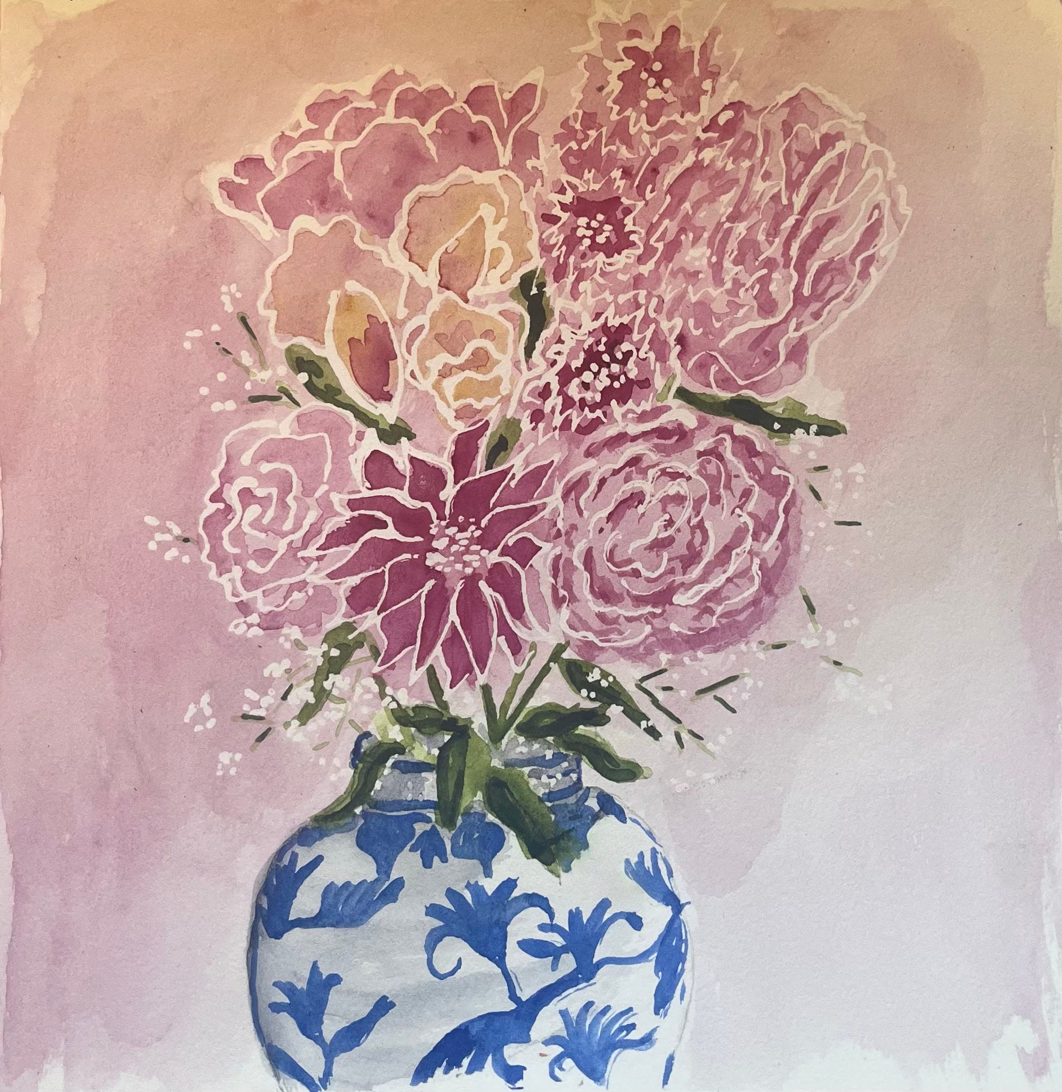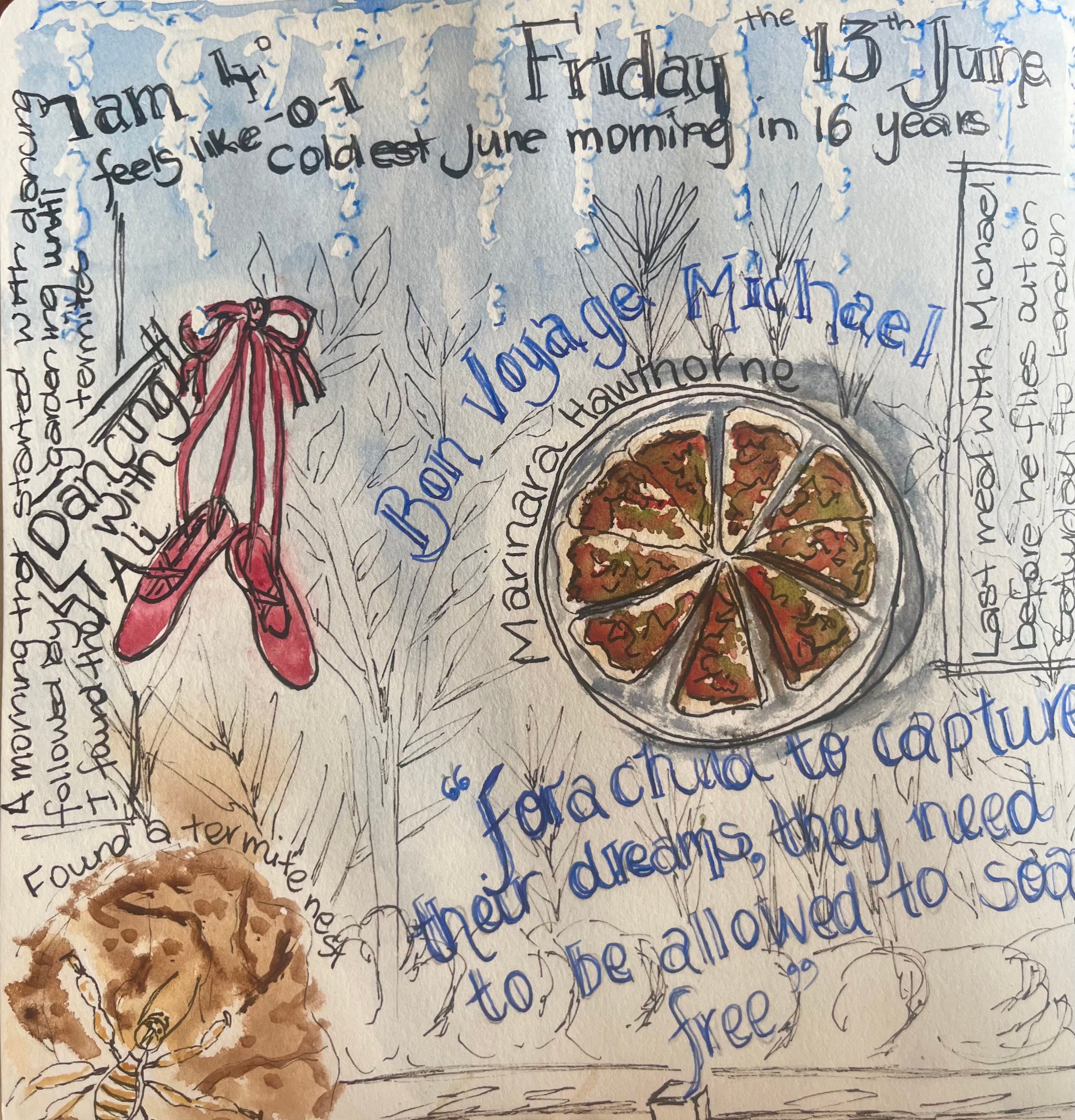 My son Michael brought me flowers which inspired this page. I had so much fun drawing the flowers using masking fluid and then painting over with water colour. When I revisit this page, I am reminded of the surprise and love I felt when Michael got back from his walk and handed me these flowers.